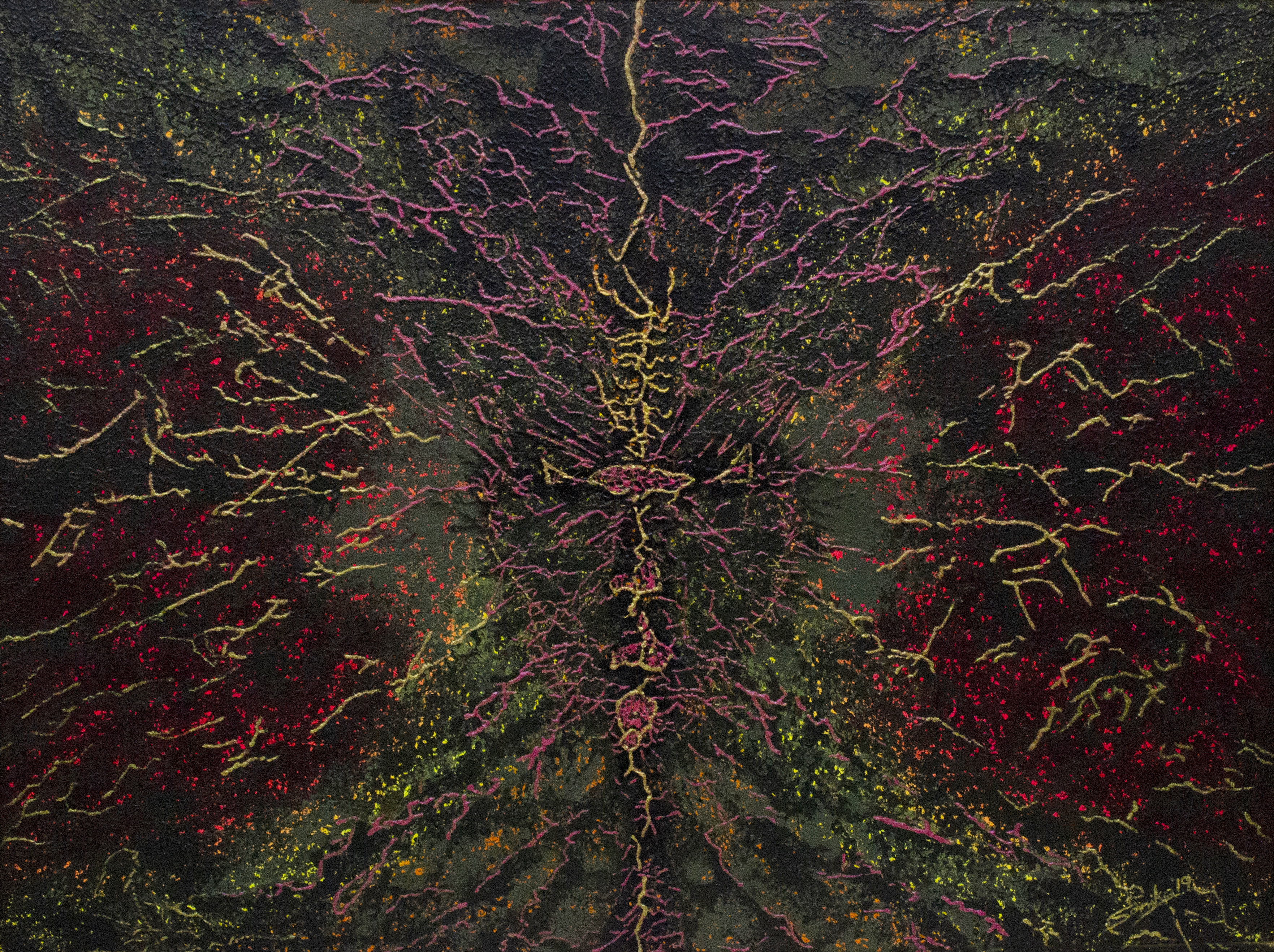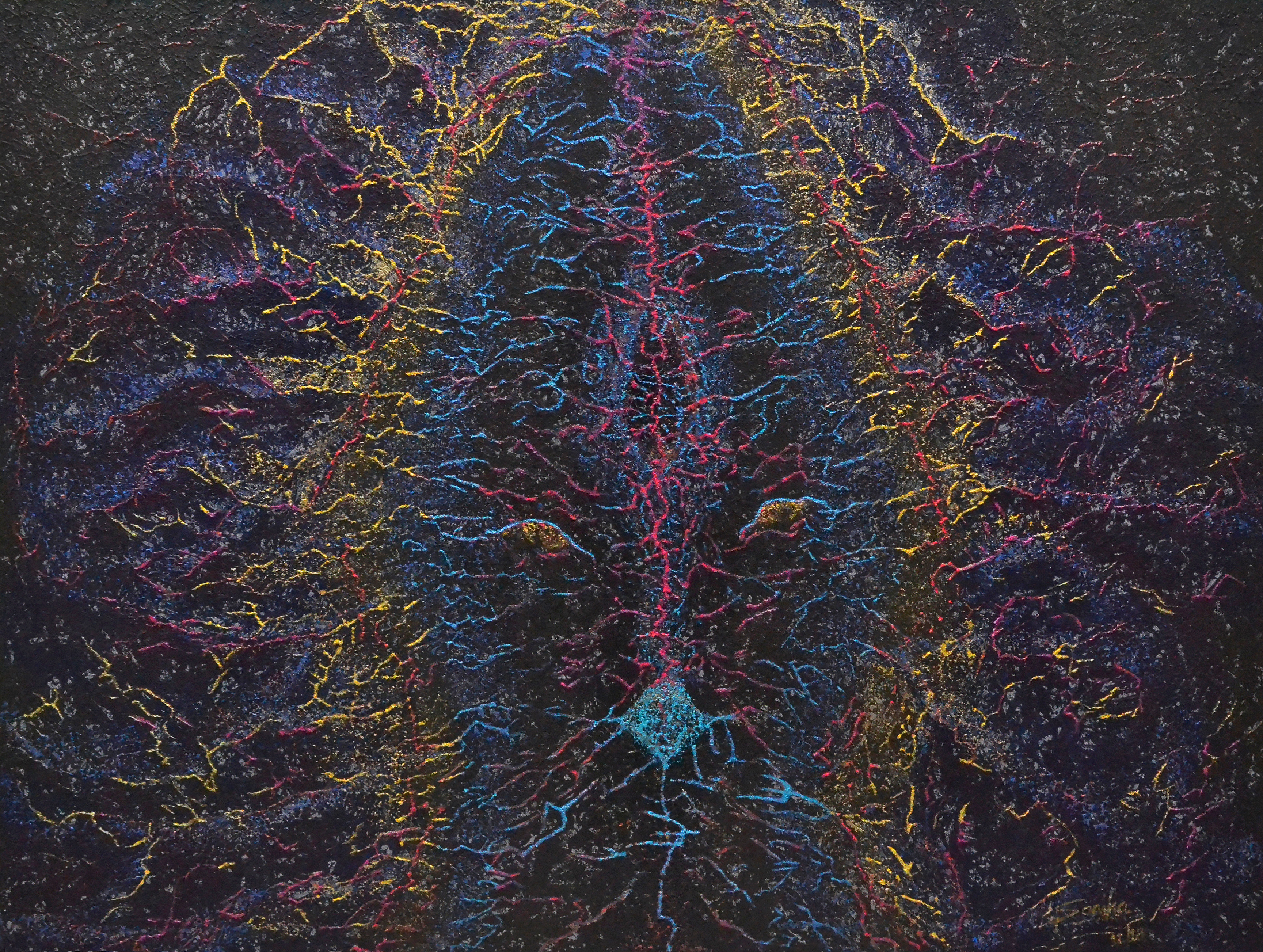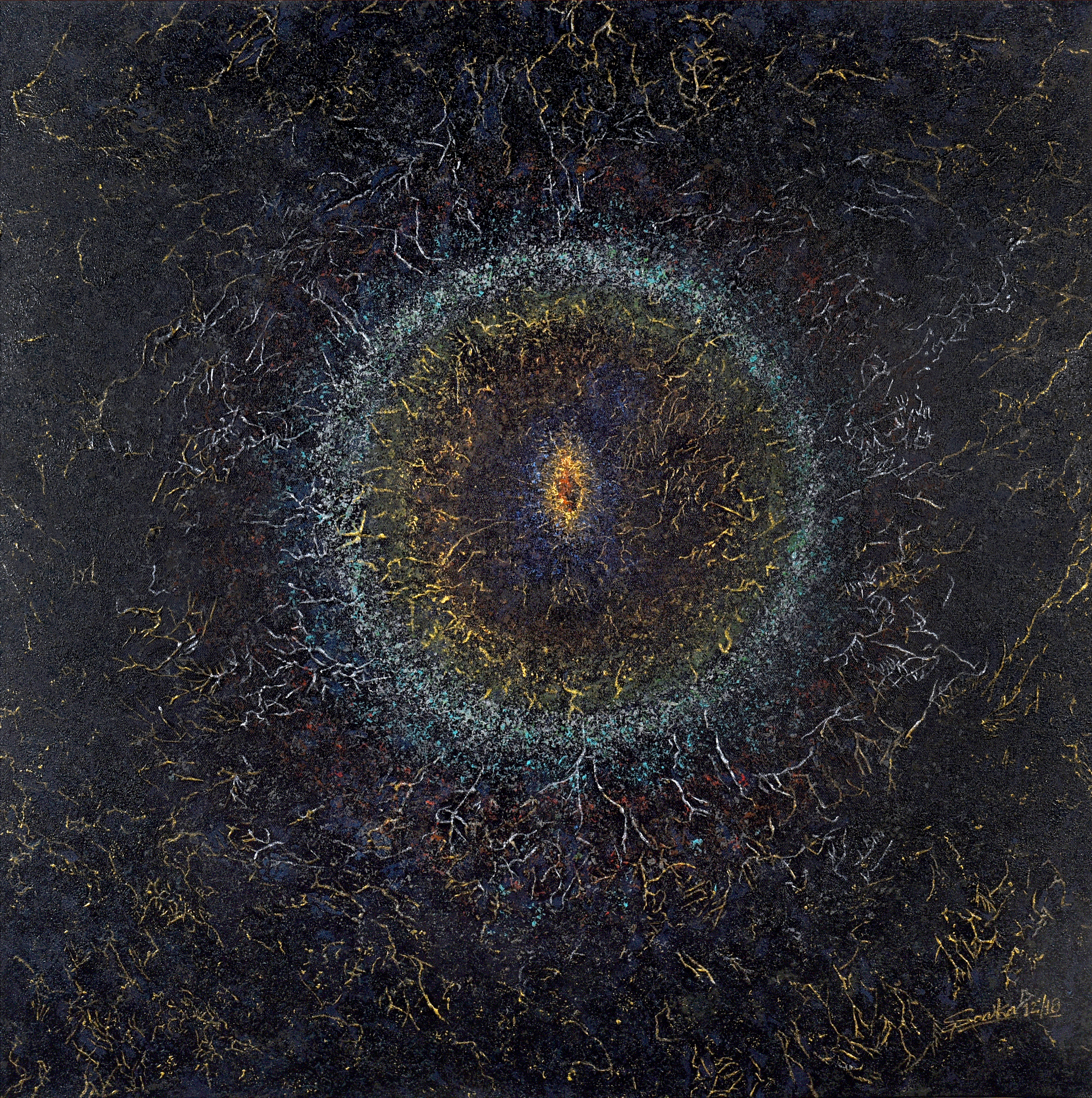 The artwork of artist Sonika Agarwal touches upon these various aspects of Cosmic belief, understanding and philosophy in a manner that is deeply visual and experiential. Her paintings evoke a very personal and yet universal understanding of the Cosmic belief and energy and it touches the inner core of humanity, shaking loose the weight of our own mundane existence with the power to embrace something larger something that is both scientific yet divine. The opposites of light and dark come together in a unifying moment that is truly both spiritual and also deeply physical so that one may experience and contemplate the unity of these diversities present in our universe.