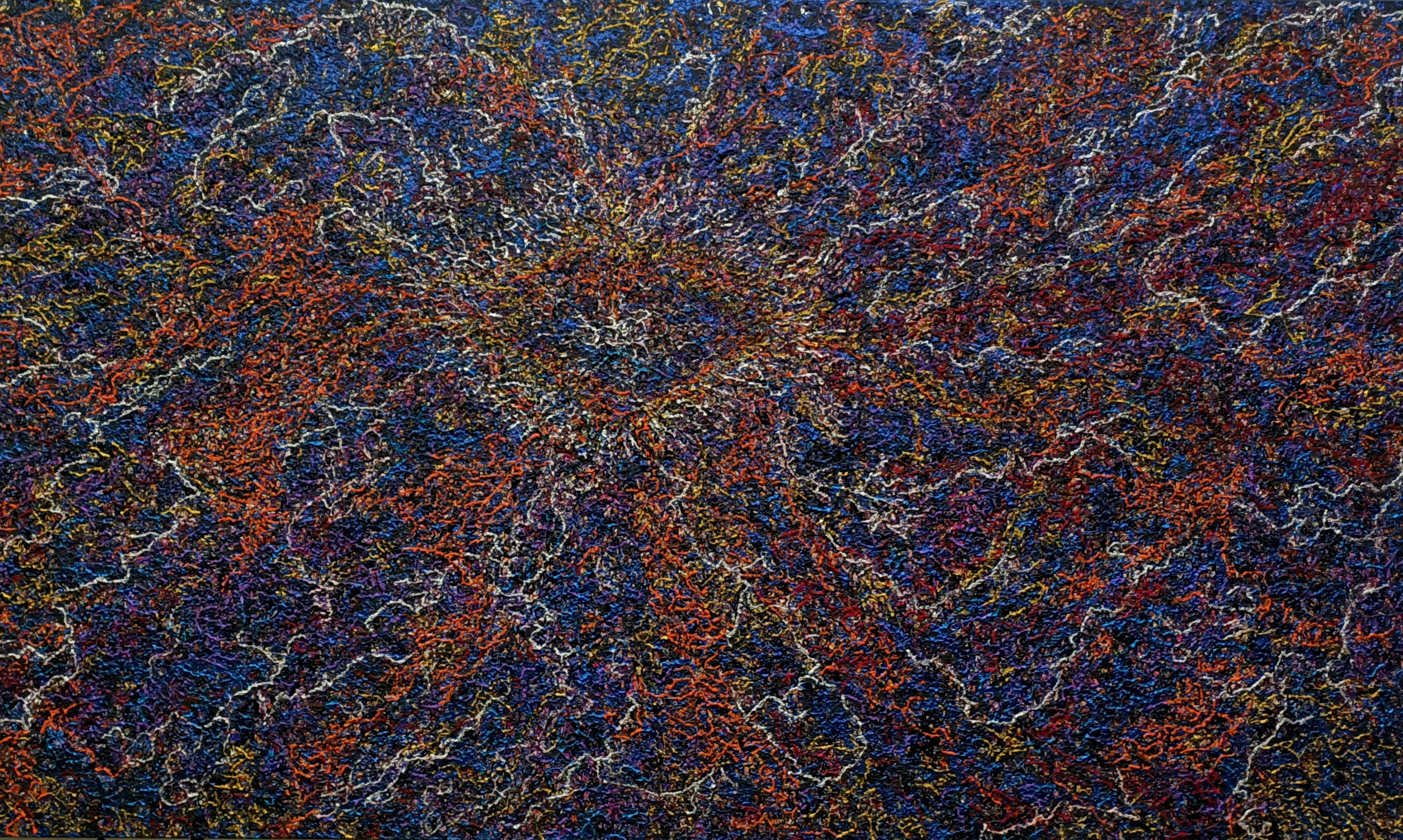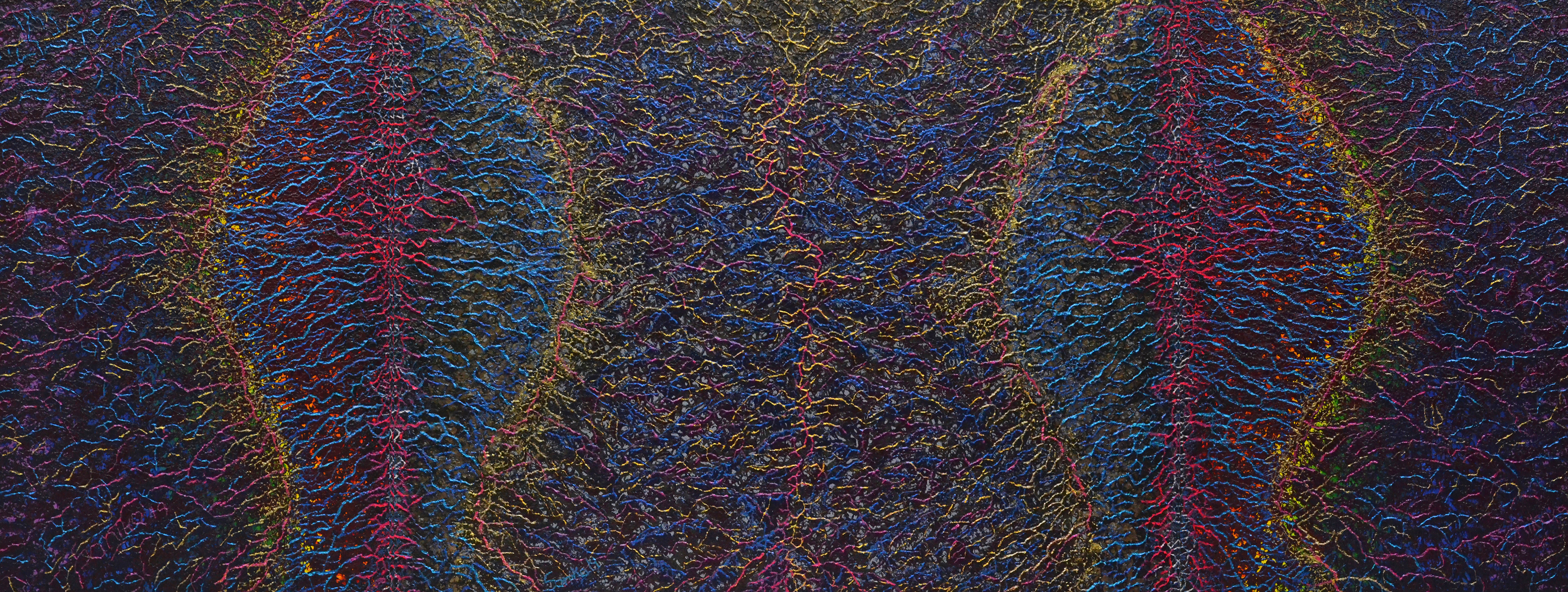 The ease of bringing together scientific belief and the Vedic understanding of the universe is almost seamless in Sonika’s approach; the metaphorical is evoked in her understanding and fascination toward the ethereal dance of life. Many artists like Edvard Munch (Dance of Life, 1900), and Henri Matisse (Le Dance, 1910) have referred to the celebration of human life. Munch employs a masculine gaze where he evokes the virgin dressed in white, the married woman dressed in red and the old widow dressed in black to symbolize these important phases of a woman’s life. Matisse preferred to focus on a group of multi-gendered nude dancers caught in a collective moment of ‘innocent freedom’ and joy, holding hands as they whirl around in space. Sonika’s dance of life is evoked by her use of abstract swirling lines, going deeper into the center of the canvas touching the primal human desire to tap into force of life. Where human energy comes together beyond the limits of physical form; rather it is in formlessness that she gathers the spirit and takes it to another level of consciousness. The cosmic ocean flows beyond the binaries of Purusha and Prakriti (male and female) encompassing the forces that are self-generating like an Electromagnetic force or a self-powered multidirectional energy.